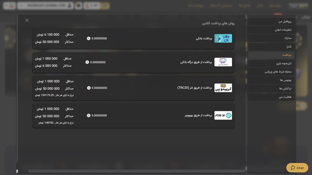 - برای مشکلات فوری مانند تأخیر در برداشت، شارژ حساب یا فعال سازی بونوس، حتماً از چت زنده استفاده کنید.